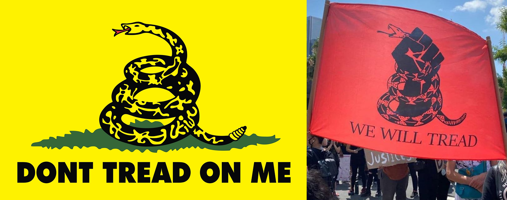 I wonder why the peaceful protests are getting flags printed which graphically convey a message about treading on snakes...