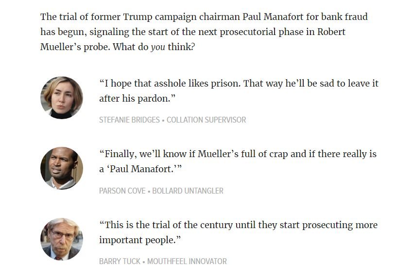 Big yawn. If he laundered money, jail the fucker. Big deal. But if a prosecutor leads with "the guy wears fancy suits, is wealthy, and deals with 'oligarchs' in the Ukraine', I would think they'd need to have some big gun evidence coming. Can they prove the meat and potatoes, or are they hoping the jury convicts because they conclude Manafort must have evaded taxes since he had so much money? If it's the latter, the prosecution will lose. Juries are pretty good at parsing this kind of thing. There will be at least 1 or 2 folks on the jury that will say you can't convict a guy because he's rich and works in the Ukraine for rich Ukrainians.
