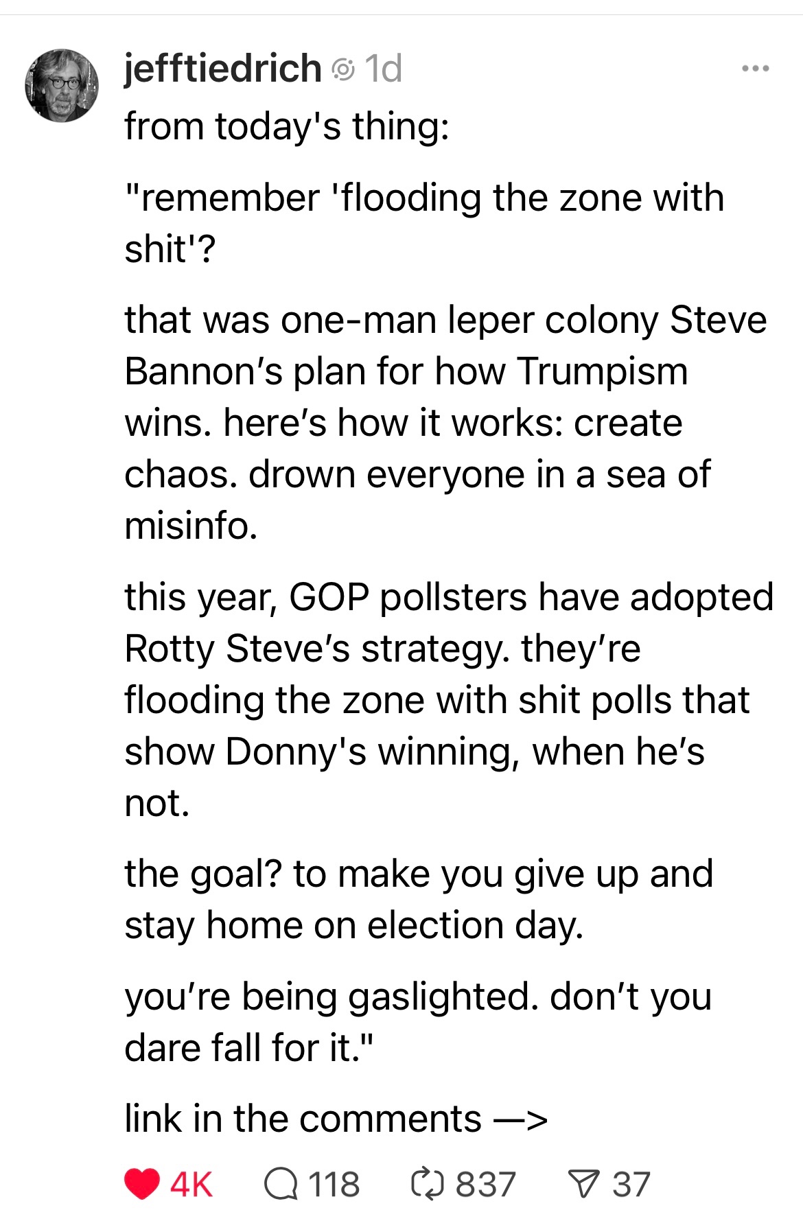 https://www.hopiumchronicles.com/p/vp-h ... re-workingSince late August more than 70 right-aligned polls have been dropped into the polling averages. The two states that have been worked the hardest are North Carolina and Pennsylvania. In October of the 27 Presidential polls released in Pennsylvania, 16 are from right-aligned pollsters, a majority. Since August 31st of the 41 Presidential polls released in North Carolina, 21, a majority have home come from right aligned pollsters.