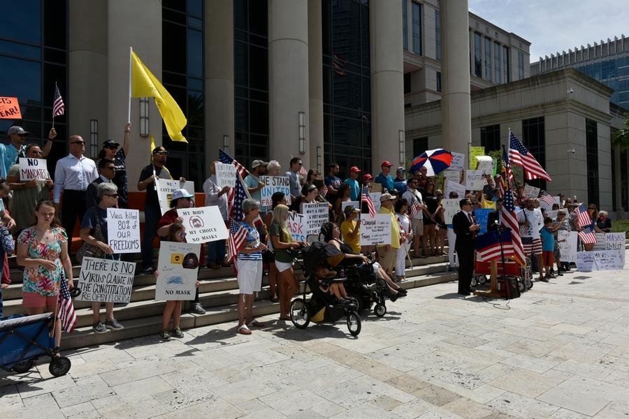 Protesters attend a “Freedom Rally” opposed to the city’s mandate to wear masks Monday, July 6, 2020 at the Duval County Courthouse in Jacksonville, Florida. [Will Dickey/Florida Times-Union]