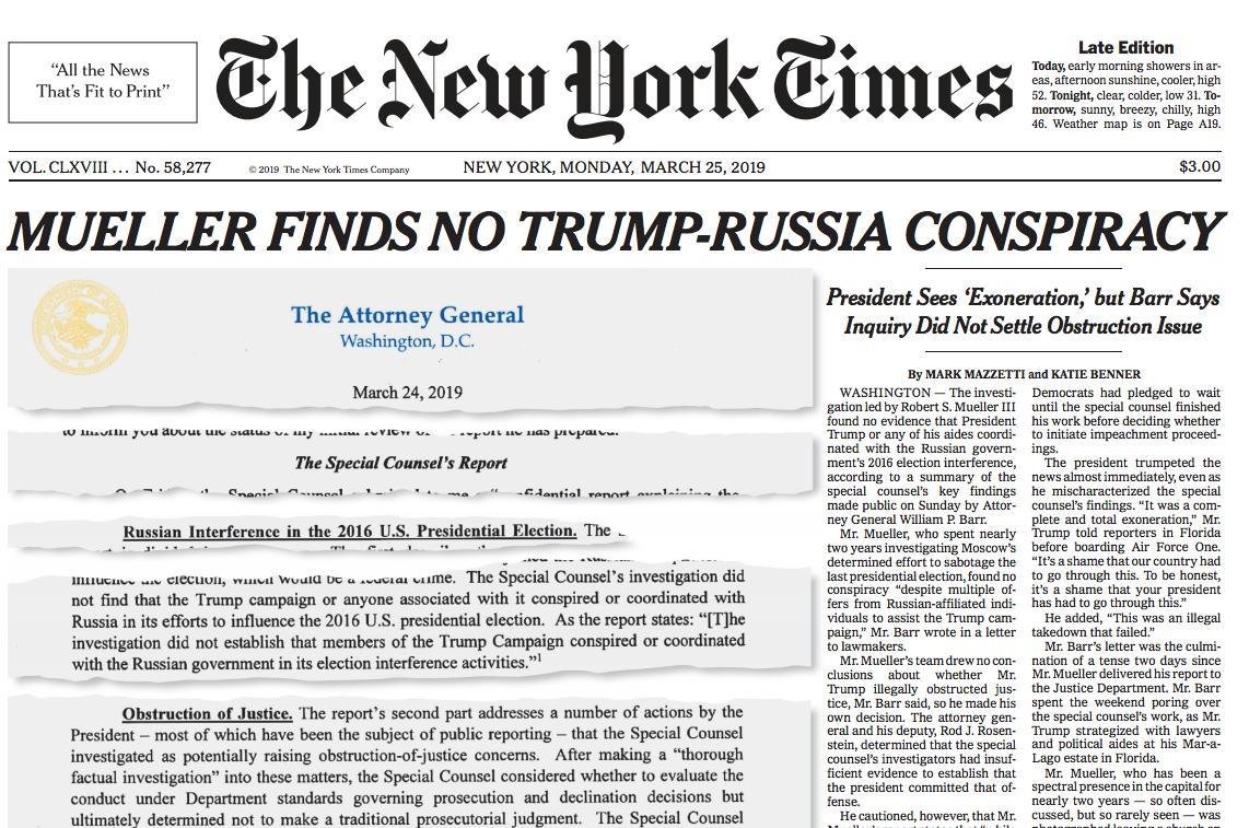 An evaluation of the Russia investigation:pErvinalia wrote: ↑Sat Mar 23, 2019 3:21 amIf there's no finding of collusion I want to hear Cunt explain his silly conspiracy theory that the left were out to get Trump. They didn't do a very good job at conspiracy if they came up with nothing.