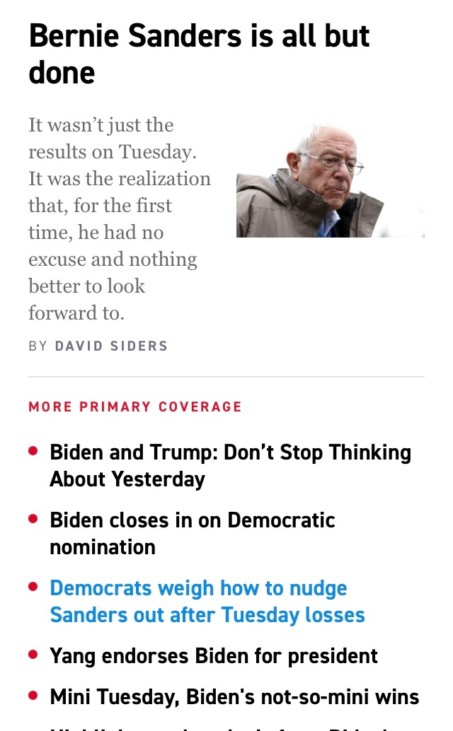 He doesn't stand for anything. He's a run of the mill centrist career politician. Don't get me wrong, he's vastly preferable to even the best Republican, but my feeling toward him is 'meh'. He's emblematic of the status quo that led to Trump being elected.pErvinalia wrote: ↑Wed Mar 11, 2020 2:41 amHow do the lefties here (particularly the Merkin ones) feel about Biden as a candidate? Sell-out centrist, or anyone but Trump, or both, and/or something else?