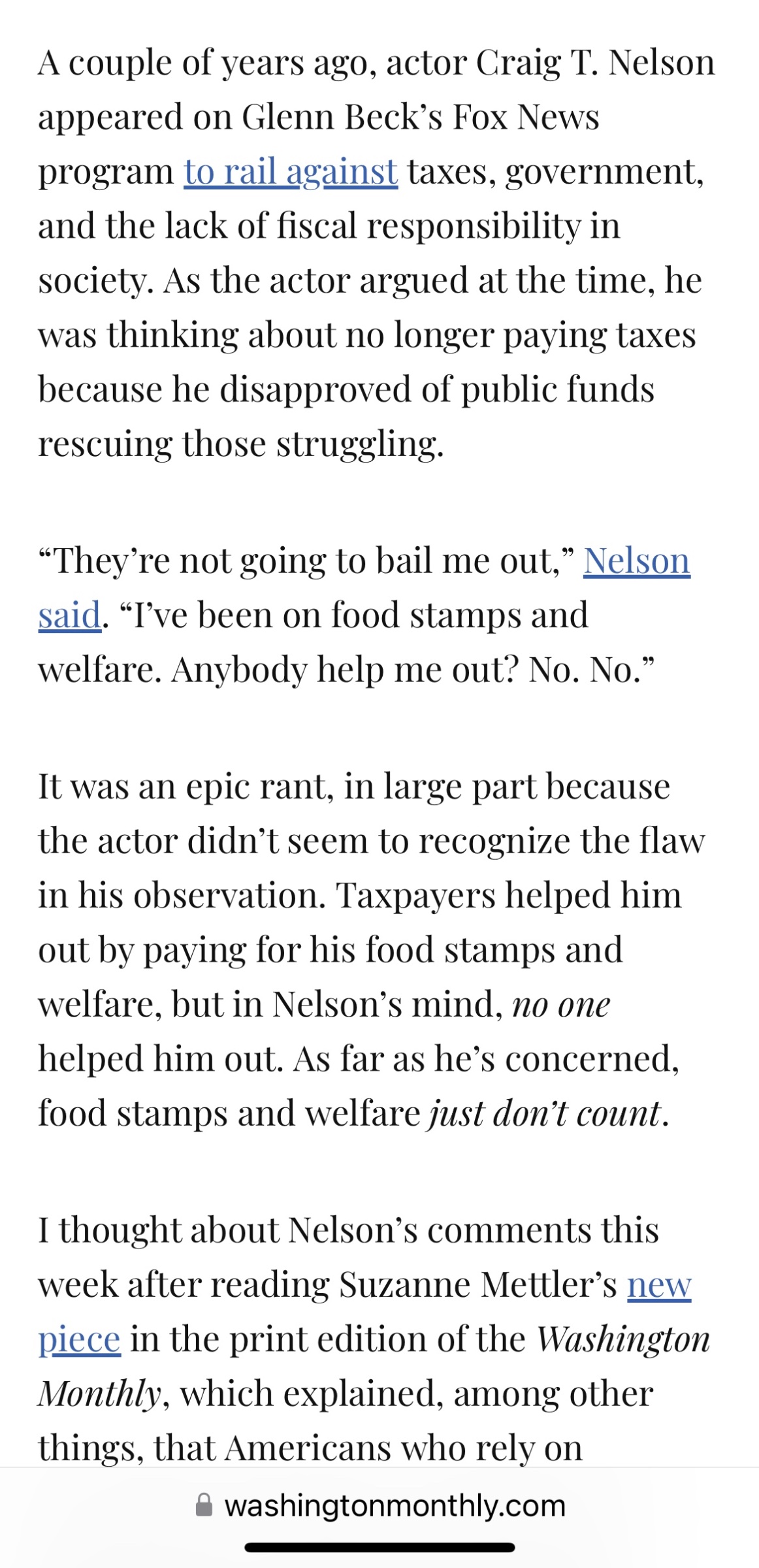It was an epic rant, in large part because the actor didn’t seem to recognize the flaw in his observation. Taxpayers helped him out by paying for his food stamps and welfare, but in Nelson’s mind, no one helped him out. As far as he’s concerned, food stamps and welfare just don’t count.