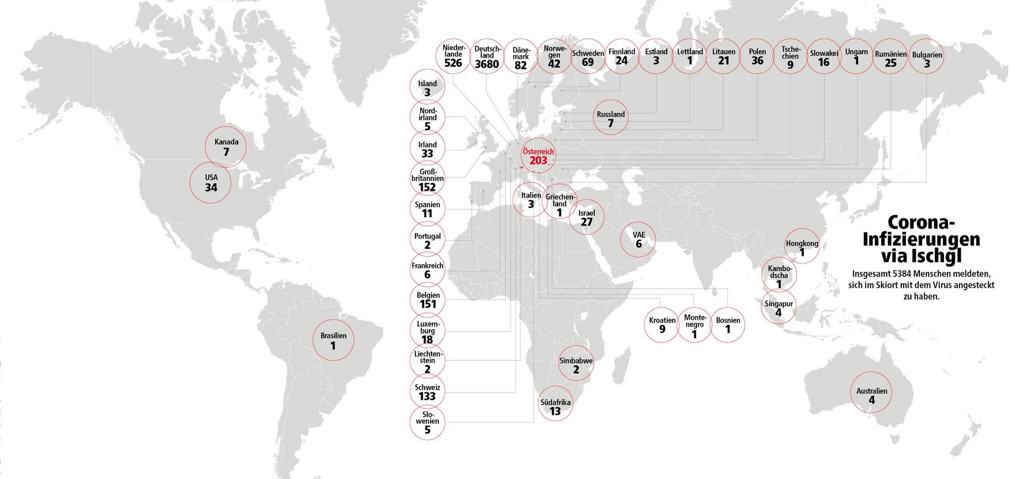 Shows known cases of people tested positive after returning from winter vacation in Ischgl, Austria.