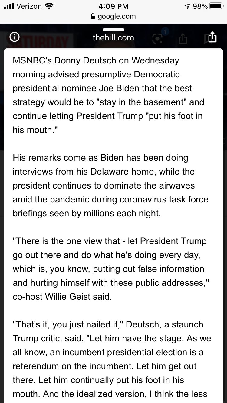 Deutsch added that Biden, a former vice president, is "comfort food, we can trust him. We know he's solid. Even if he completely disappeared and just gave the stage to Trump, that would be a win for him."