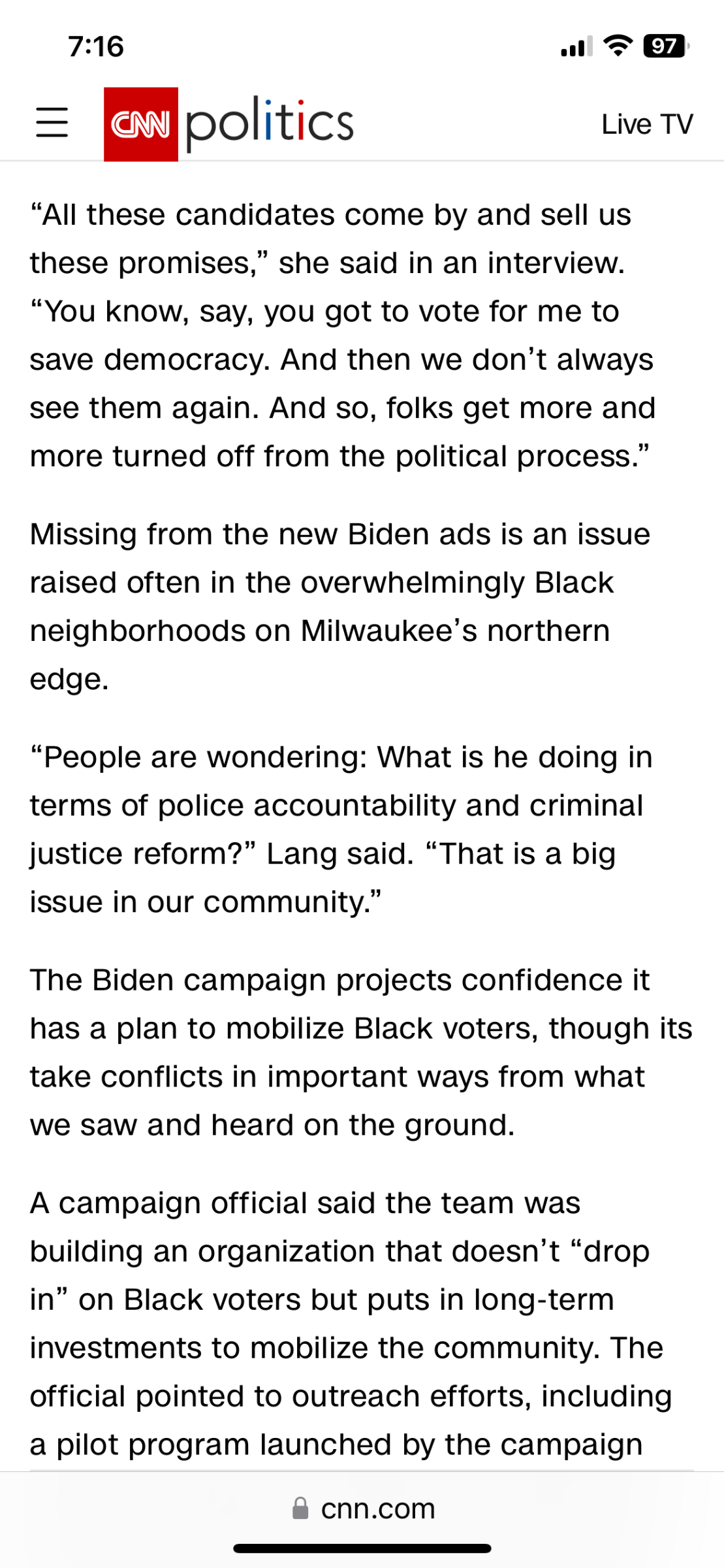 Black voters want better criminal justice. Which is not Biden's to run, other than funding. The problem is once again getting voters to show up based on issues that deal with local matters. While Biden is running foreign policy.