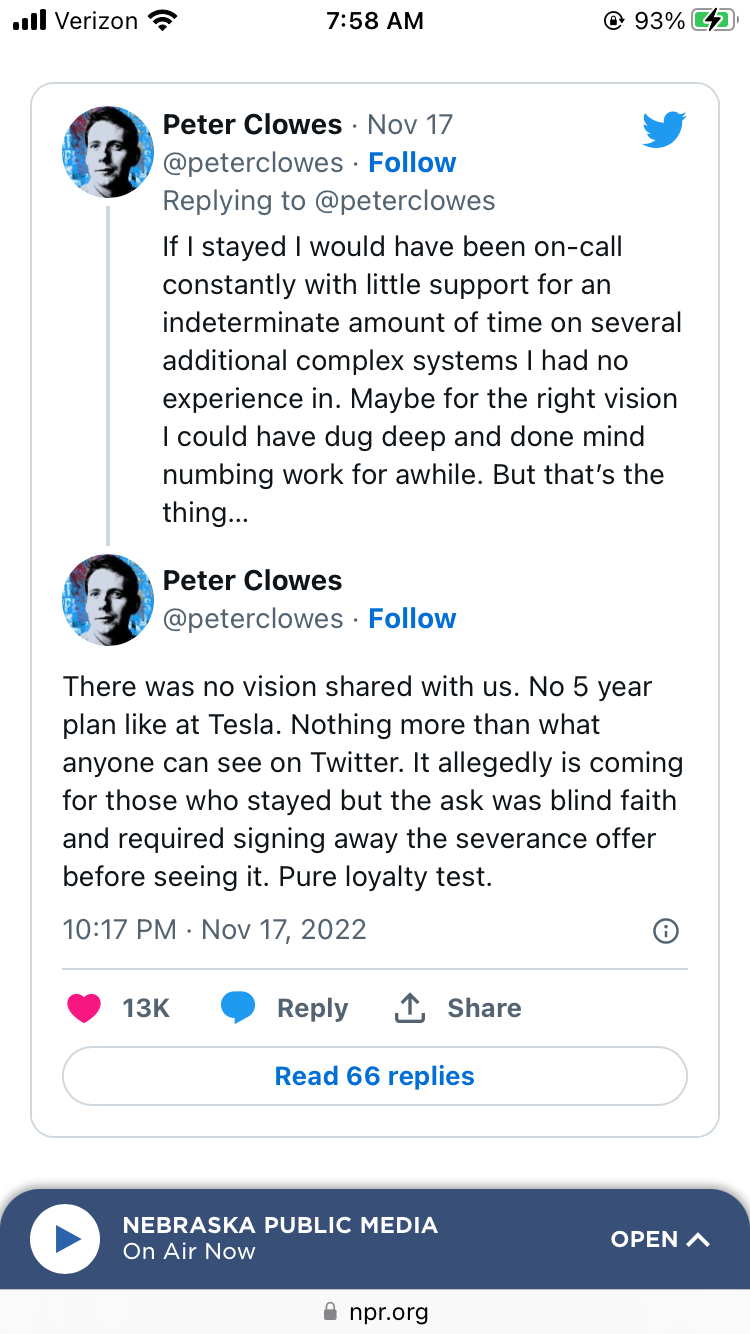 Reason for hope: Financially, Twitter is in a better position than many rivals. If the Musk deal goes through, shareholders will get bought out at a good price ($54.20 per share), and the company — which will no longer be publicly traded — will get some relief from the pressures of the markets.