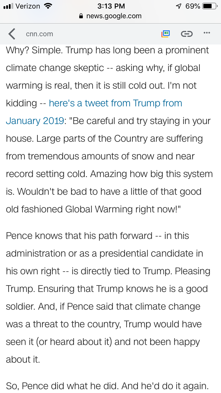Climate change is not real because its too expensive to fix it. And we want cars. And Trump said so. So Pence wags his tail.