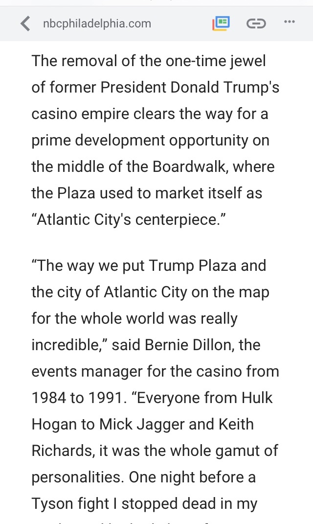 The way we put Trump Plaza and the city of Atlantic City on the map for the whole world was really incredible,” said Bernie Dillon, the events manager for the casino from 1984 to 1991. “Everyone from Hulk Hogan to Mick Jagger and Keith Richards, it was the whole gamut of personalities. One night before a Tyson fight I stopped dead in my tracks and looked about four rows in as the place was filling up, and there were two guys leaning in close and having a private conversation: Jack Nicholson and Warren Beatty."