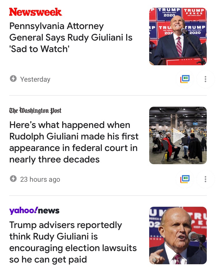 Anyway, here's video of Rudy Giuliani doing a press conference with a sweat/hair-dye mixture dripping down his face: