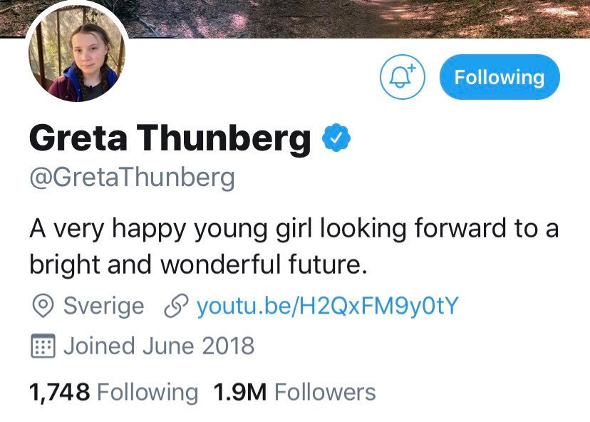 She's updated her twitter profile.Brian Peacock wrote: ↑Tue Sep 24, 2019 10:18 amTrump, the sad oaf, has tried to troll her this morning with some pretty poor sarcasm. I suppose he thinks if the internet is talking about her then he needs to wedge himself into that conversation even if it means acting like an arsehole.