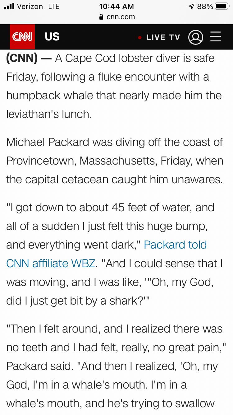 "All of a sudden he went up to the surface and just erupted and started shaking his head," Packard said. "I just got thrown in the air, and landed in the water and I was free and I just floated there."