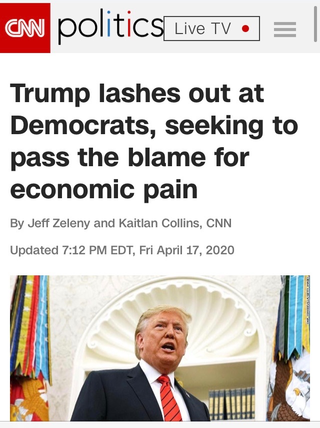 It is, in part, diversion. The response of the Trump administration to the pandemic crisis has been bumbling, inadequate, and quite possibly corrupt—the apparently political distribution of crucial medical supplies and now the Payroll Protection Program loans designed to help small businesses is drawing scrutiny. The economy, on which Trump pinned his hopes for reelection, is in free fall. As his approval rating drops, Trump wants to energize voters to focus not on his handling of the coronavirus, but instead on blaming Democratic leaders for the economic crisis.