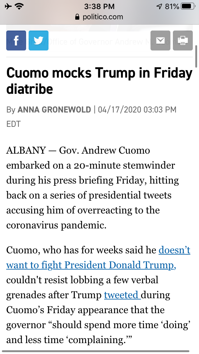 Cuomo said the federal help he requested has been based on White House projections for the state’s medical needs and suggested Trump hasn’t read any of the reports his administration has issued through the Centers for Disease Control and the White House coronavirus task force.