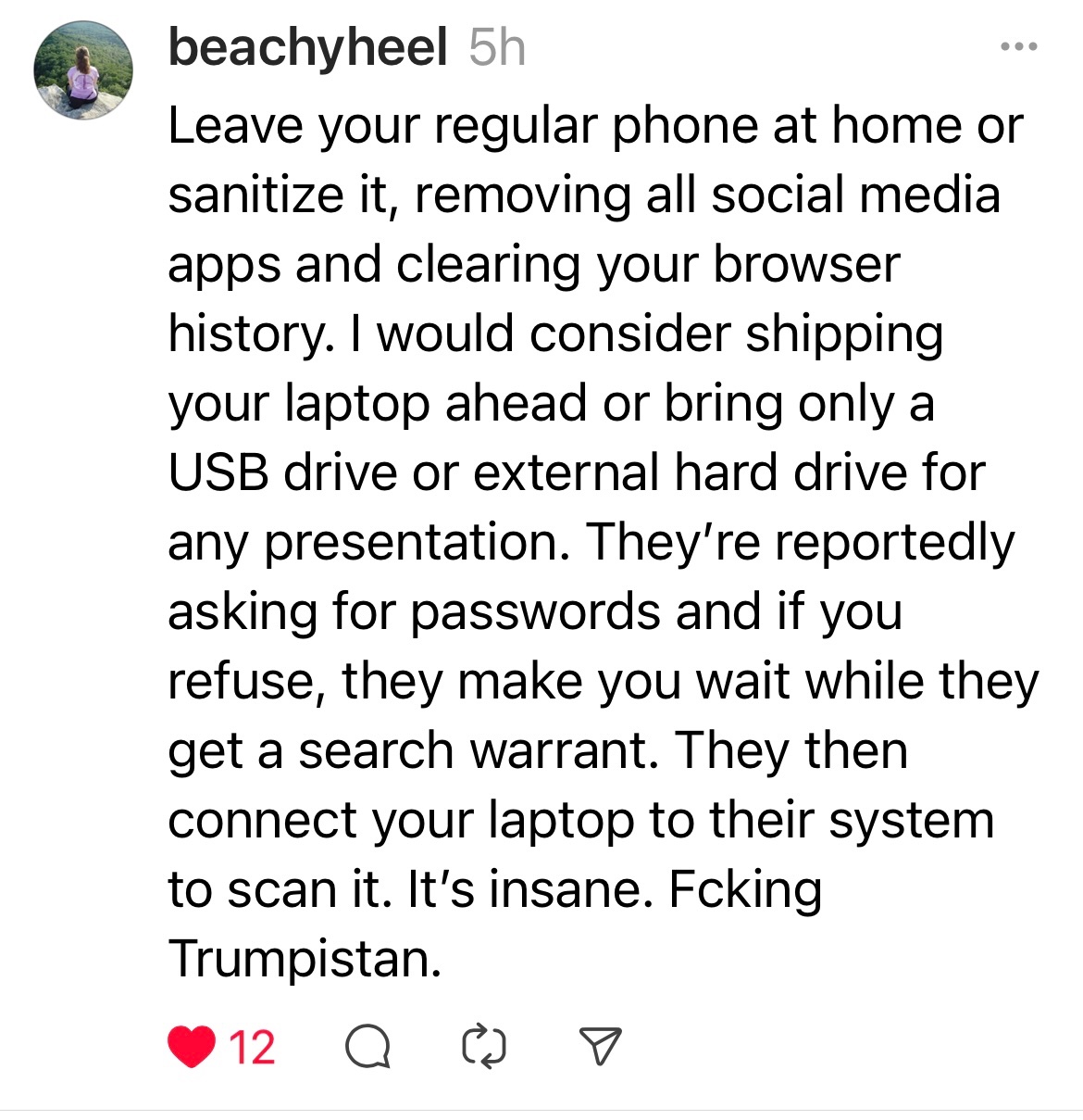 Visitors and speakers at conferences now sent back as anti-trumpian. Laptops examined. I will be carrying a tablet and will delete even my browser on return.