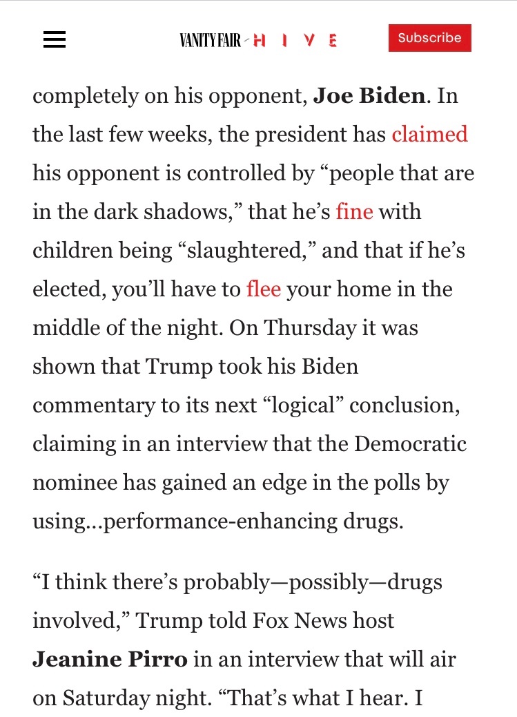 Notice that even in the fog of his pathological lies and dementia, a teeny-tiny part of Trump knows that he’s full of shit, hence the hedging that the Democratic nominee for president of the United States is “probably,” “possibly” on drugs. Still, that doesn’t stop him from floating the idea that there’s no other explanation for Biden performing well on the campaign trail than perhaps that he’s juicing.