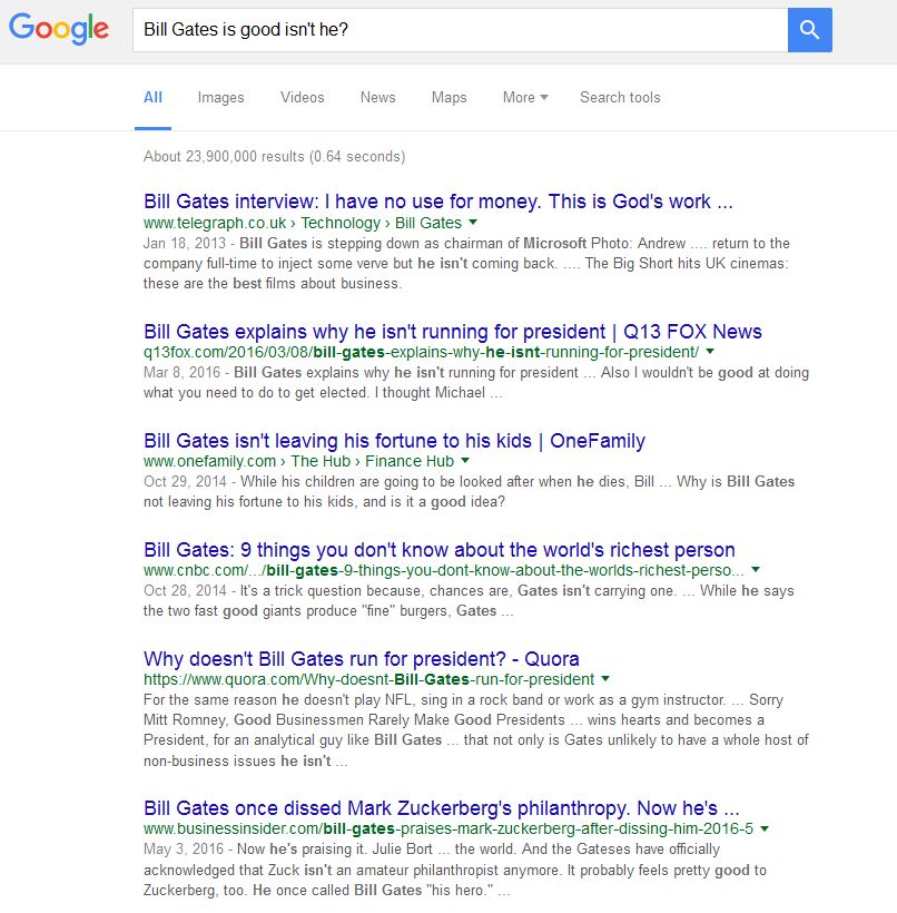 Google is very personal and AI driven these days. If you don't have any interest in Zika or Ebola it won't bother making you a connection. I notice there's some interest in Bill's wealth going on with you though?