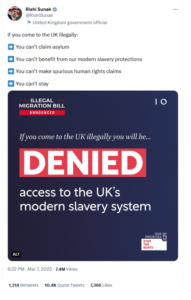 Give Fishi Rishi a break. The proposed bill will simply say that some people who do not arrive in Britain to claim asylum via a government defined 'safe and legal route' will not benefit from international human rights, migration, refuge and asylum law, or anti-modern slavery law, and will therefore be immediately detained upon arrival anywhere in the British Isles without reference to the courts, will forfeit all rights to a judicial review of the decision to detain them, will forfeit all rights to appeal, and will be returned to their country of origin (or a 'safe' third country to be determined by the government) within 28 days.