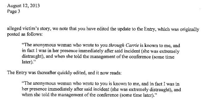Sad. Especially if she's telling the truth.lordpasternack wrote:That isn't the alleged victim's own testimony - and the other person could be implying "immediately after she'd emerged from Shermer's room".rEvolutionist wrote:Ok, I just checked, it's from both (i.e. the lawyer letter quoting the blog). FTB was down earlier, so I don't know if you will be able to view it at the moment. I've got it cached in pdf, so I've attached a screenshot of the relevant bit.