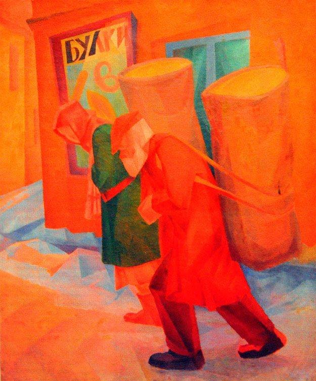 "Man and Woman Carrying Large Baskets" painting by famous Soviet Ukrainian avant-garde artist Alexander Bogomazov, 1928