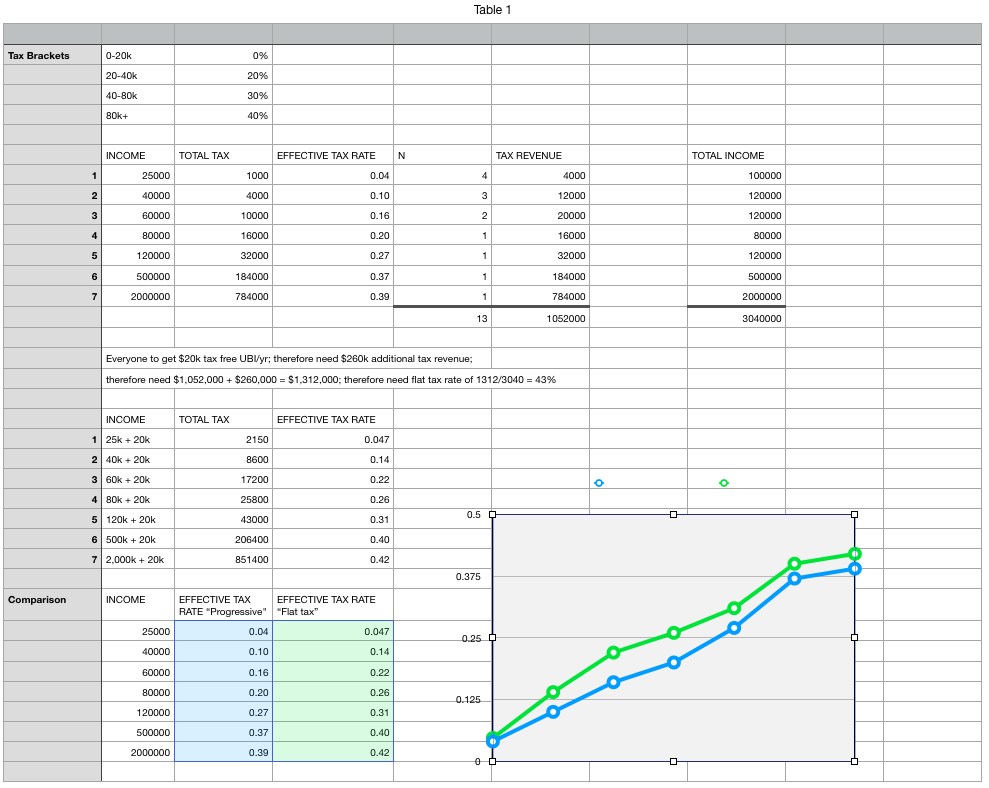 Just did some random(ish) calculations and by these, if they reflect reality, a UBI + flat tax is not only worse off for everyone (who pays tax), but also less progressive than a regular progressive taxation system.