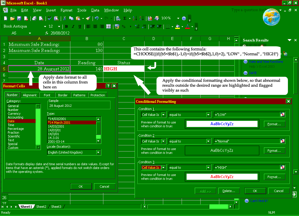 [3] Whilst that cell into which you've pasted the formula is highlighted, select from the menu the menu item:=CHOOSE((if((b5<$b$1),-1,0)+if((b5>$b$2),1,0)+2), "LOW" , "Normal" , "HIGH")