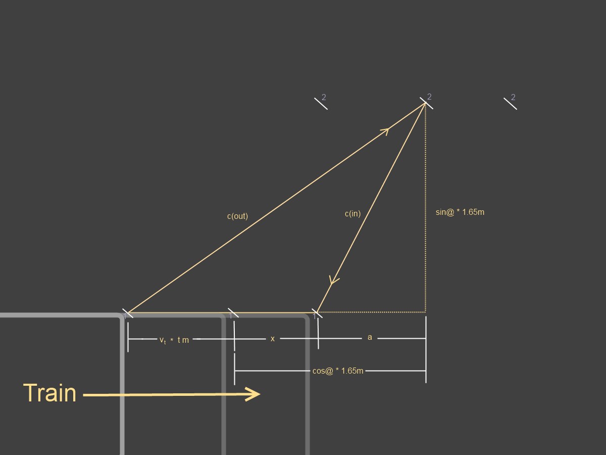One point to note is that this only works for train speeds that are below a certain speed. Above a certain speed c(in) will trace a line away in the direction of train travel from the reflector (2). I haven't put any thinking power towards determining the equations for that. They won't be significantly different I guess.