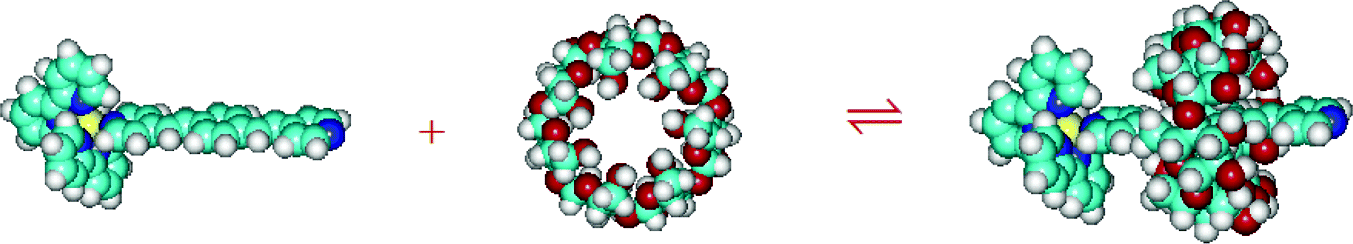 Toma et al, 2004 wrote:Two novel ruthenium polypyridine complexes, [Ru(bpy)2Cl(BPEB)](PF6) and {[Ru(bpy)2Cl]2(BPEB)}(PF6)2 (BPEB = trans-1,4-bis[2-(4-pyridyl)ethenyl]benzene), were synthesized and their characterization carried out by means of elemental analysis, UV−visible spectroscopy, positive ion electrospray (ESI-MS), and tandem mass (ESI-MS/MS) spectrometry, as well as by NMR spectroscopy and cyclic voltammetry. Cyclic and differential pulse voltammetry for the mononuclear complex showed three set of waves around 1.2 V (Ru2+/3+), −1.0 V (BPEB0/-), and −1.15 (BPEB-/2-). This complex exhibited aggregation phenomena in aqueous solution, involving π−π stacking of the planar, hydrophobic BPEB ligands. According to NMR measurements and variable-temperature experiments, the addition of β-cyclodextrin (βCD) to [Ru(bpy)2Cl(BPEB)]+ leads to an inclusion complex, breaking down the aggregated array.
