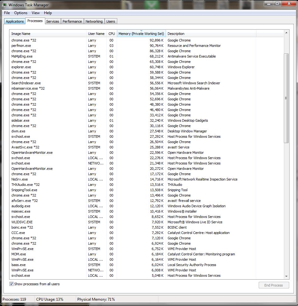 Christ there's a lot of Chrome processes there. That doesn't seem normal to me. There really should only be one (unless chrome works differently from other software). Click on the "memory" column once, or twice if necessary, to sort via memory usage with the biggest usage up the top and post a screenshot.