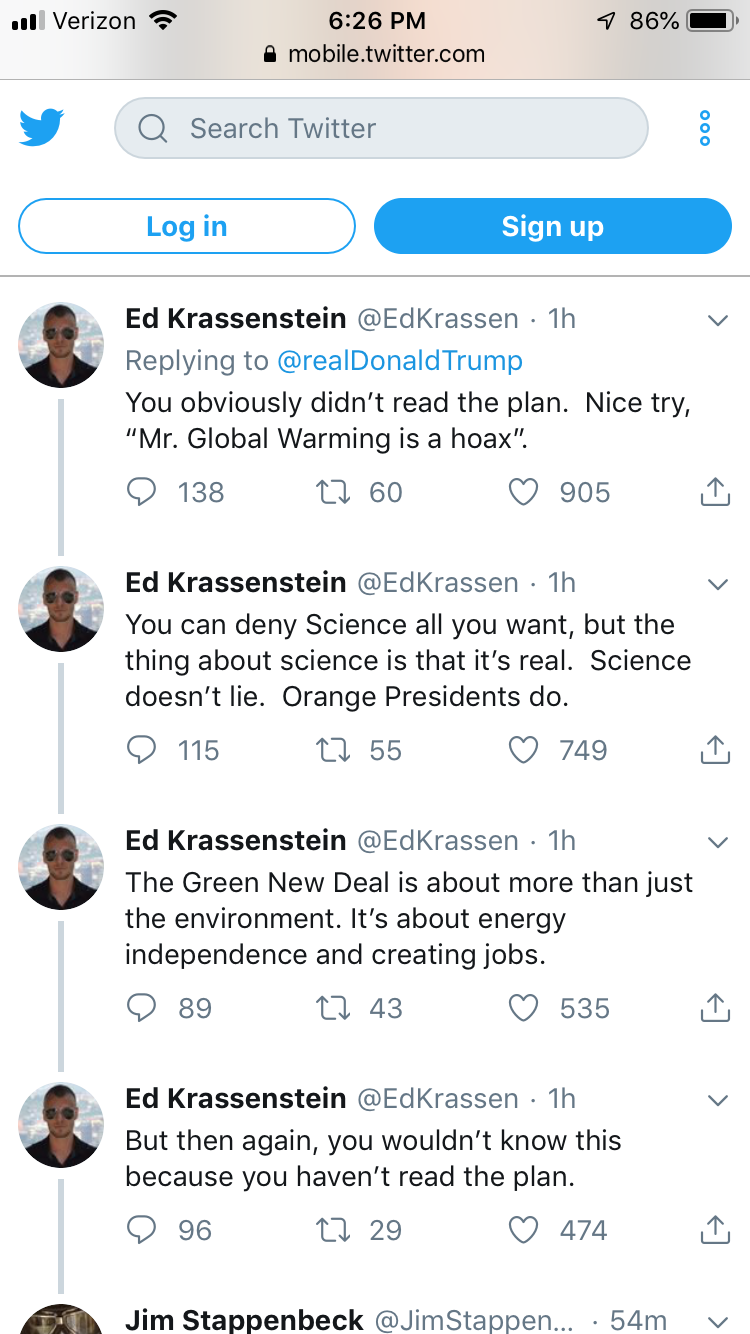 Trump summarizes New Green Deal as getting rid of cars planes etcBrilliant! Ed responded...