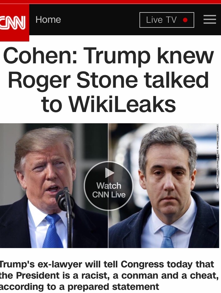 Yeah, but everybody lies. There's nothing illegal about that.“In July 2016, days before the Democratic convention, I was in Mr Trump’s office when his secretary announced that Roger Stone was on the phone. Mr Trump put Mr Stone on the speakerphone,” Cohen’s opening statement reads.