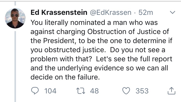 I'll be interested to see how much they can tell us lowly citizen types. Personally, I'd call Lindsey Graham's bluff on a special prosecutor for the Clinton email thing in exchange for maximum daylight for the Mueller report. But, that's why I'm an independent, neither party will have me.