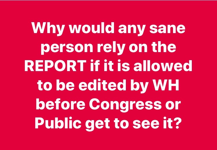Apparently we're reading it differently. It questions why a sane person would rely on the report if it's been edited by the White House. I take that as questioning whether this sane person would believe that an edited report would represent an accurate version of the original report. For instance if the investigation had uncovered borderline criminal activity on the part of the Trump campaign that didn't rise to the level of a prosecutable offense. Or if it had uncovered evidence of a prosecutable offense but the evidence wasn't strong enough to pursue prosecution. I think things of this sort should be made public. However, the White House could very well redact the above or anything else that it considers detrimental to Trump.Sean Hayden wrote: ↑Fri Mar 29, 2019 6:11 amI was responding to the point that a sane person couldn't trust that an edited report would support Mueller's actual findings.