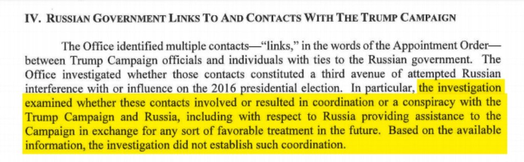 That you were able to cite a single instance reporting no evidence is all very well, but your other images don't say that. The report makes an important distinction in the sentence that I quoted, one which Trump and those who parrot his lies would like to ignore. The image you posted refers to findings on a narrow question--whether there was coordination between the IRA troll farm and US persons.Forty Two wrote: ↑Fri Apr 26, 2019 4:11 pmYes, but that doesn't change the fact that that Mueller did say "there was no evidence." Saying they found no evidence means that there was no evidence. No evidence.jpgL'Emmerdeur wrote: ↑Fri Apr 26, 2019 2:59 pmThere is an important point in page 2 of the report, a guideline on how to read subsequent statements:
