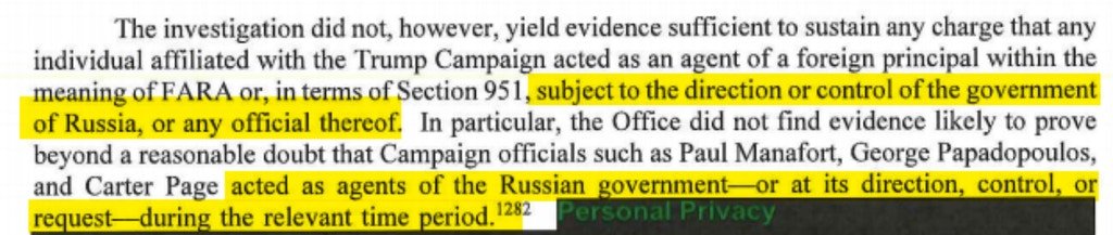 Yes, but that doesn't change the fact that that Mueller did say "there was no evidence." Saying they found no evidence means that there was no evidence.L'Emmerdeur wrote: ↑Fri Apr 26, 2019 2:59 pmThere is an important point in page 2 of the report, a guideline on how to read subsequent statements: