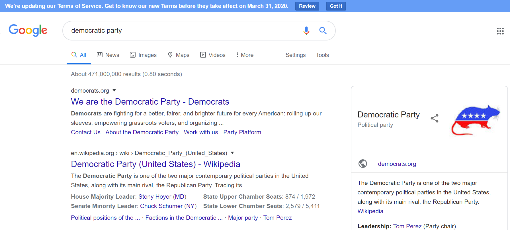 Did you know that, earlier today, the google search on democrats had a 'rat' icon instead of a donkey? Don't know if it is still that way.