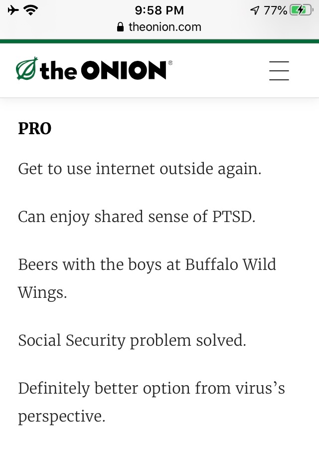 The Onion looks at the pros and cons of reopening America before the coronavirus pandemic ends.