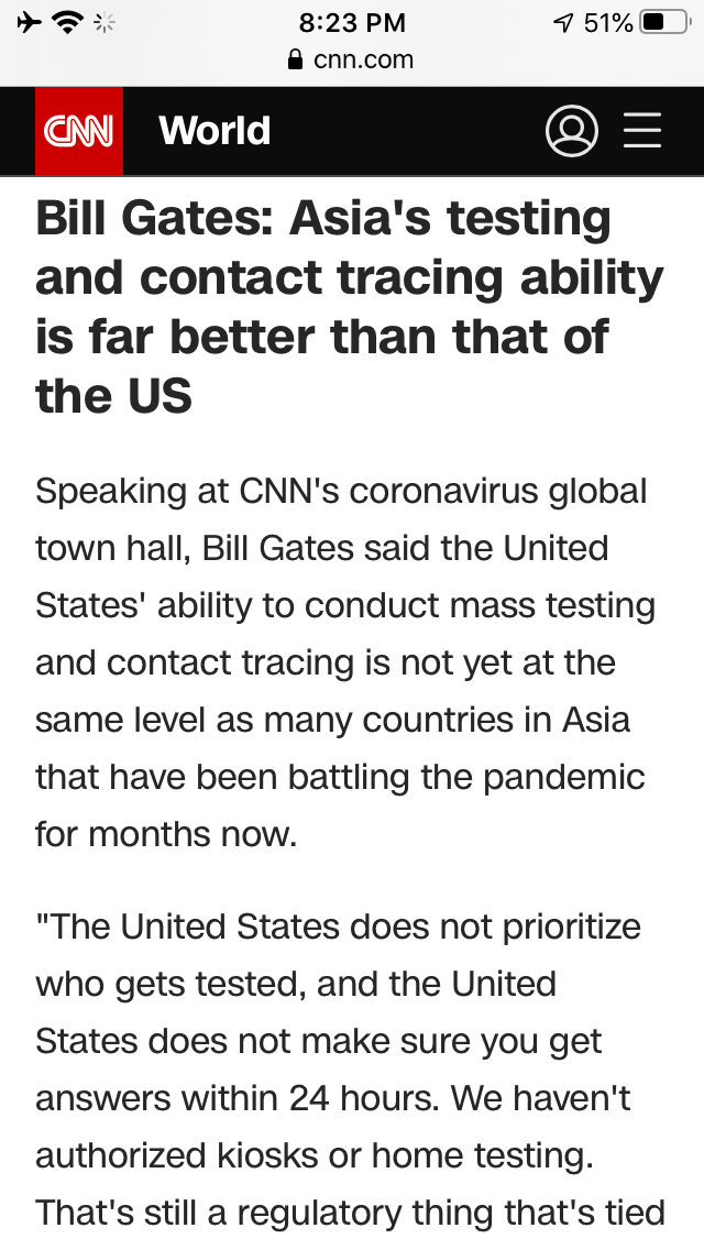 "The United States does not prioritize who gets tested, and the United States does not make sure you get answers within 24 hours. We haven't authorized kiosks or home testing. That's still a regulatory thing that's tied up. So our testing numbers should never be compared," said Gates, the co-chair of the Bill and Melinda Gates Foundation -- one of the world's biggest charities and public health donors.