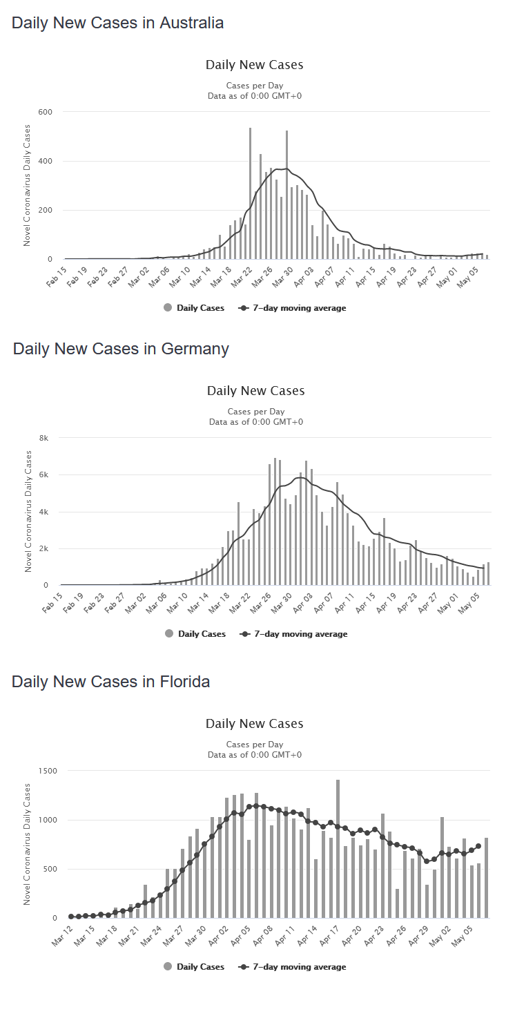 NineBerry wrote: ↑Fri May 08, 2020 9:39 pmCurves for Australia, Germany and Florida. Doesn't really look like Florida is ready yet. I'd even say that Germany is not ready yet and waiting another two weeks would have been better. But Florida is really not there yet. Unless you have setup a really rich infrastructure to do the tracing and isolating strategies.