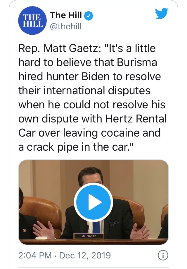 Almost none of the Biden pussygrabbing or Hunter Biden stories went anywhere. But Republicans will keep at it. Matt has his own problems. Daddy saved him from drunken driver charges. Assumed office 2017 when all those Trumpists decided to vote, 2016.
