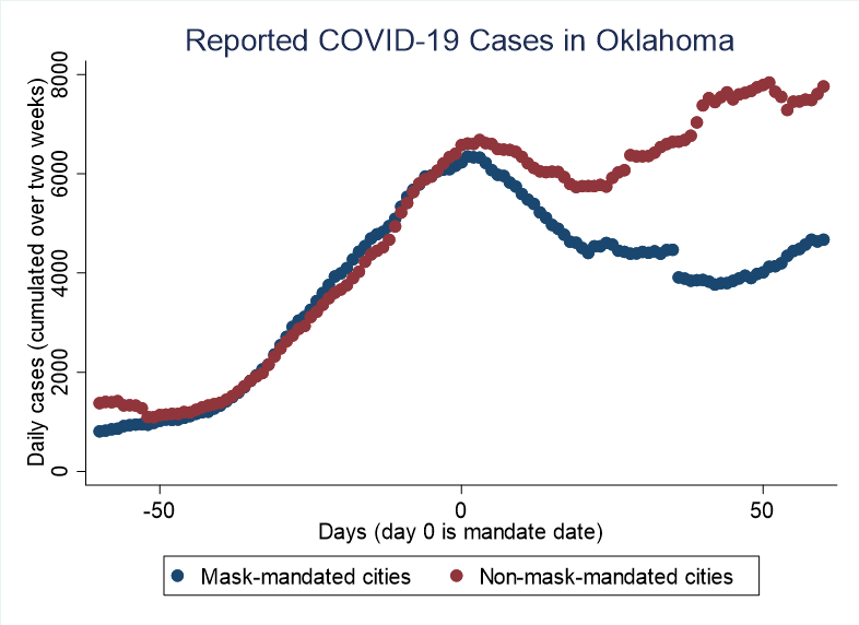 Several comparable cities in Oklahoma were studied. Some of them introduced a mask mandate on the same day while others didn't (I won't comment on party affiliation). The differences are notable.