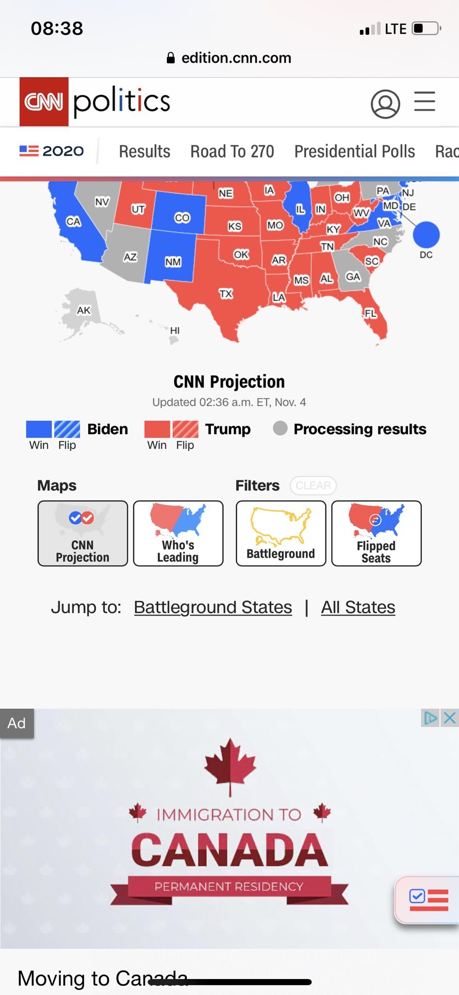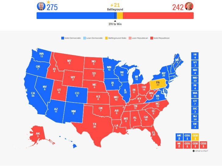 Ok. He's going to get an extra one from a seat in Maine too. Early indications on mail in and pre votes are going 3 to 1 to Biden vs Trump. If Pennsylvania follows that, Biden will win it easily. Not sure how that breaks down in Georgia. But Casey Briggs on the ABC has pointed out that the remaining ballets in Georgia are focussed around Atlanta which has so far gone strongly Dem. I'm almost quietly confident Biden will get it.