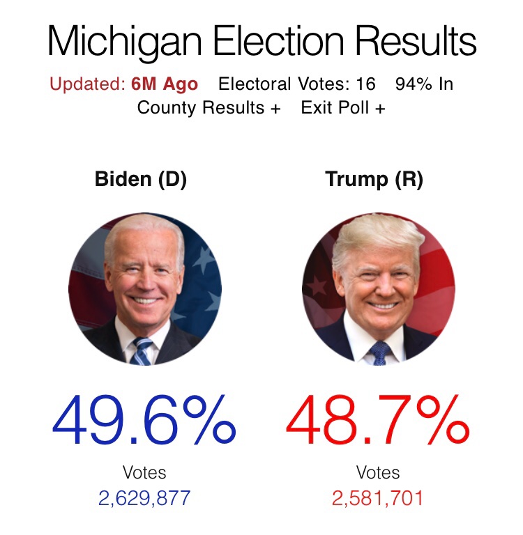 If the current leads in Nevada, Arizona, Wisconsin, and Michigan hold up, that elector gives Biden 270. It would be wild if Biden's path to the White House went through Nebraska.Tero wrote: ↑Wed Nov 04, 2020 11:33 amE252C44B-FE4D-45AE-9773-812E9B548D9A.jpeg