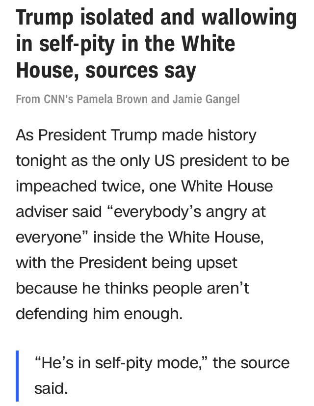 Trump is deep in debt, so that pension will save him having to sell his children.laklak wrote: ↑Wed Jan 13, 2021 11:45 pmIt's really bad political theatre but it plays well to the idiot Democrat rabble. Jesus I hate this fucking country sometimes. It's a completely useless gesture. It will not make it to the Senate floor, but even if it did, there's only a week left in his term. You can't impeach someone who isn't in fucking office. He won't get his pension? So what? He doesn't give a shit, he doesn't need the money, he already donates $399,999 of his $400,000 annual salary. Fucking children. Petulant, whiny, terminally offended, stupid children.