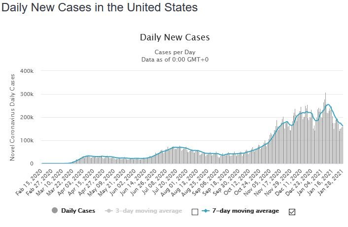You need to look at the rate of increase on the logarithmic scale. There is no detectable change in the five weeks following the publication of the Great Barrington Declaration. The gradient increases a few days after Halloween and stays steady at that angle until halfway through January. Then it dips slightly.rainbow wrote: ↑Fri Jan 29, 2021 12:01 pmThe daily new cases from World-o-Meter shows better detail coupled with the 7-day moving average: