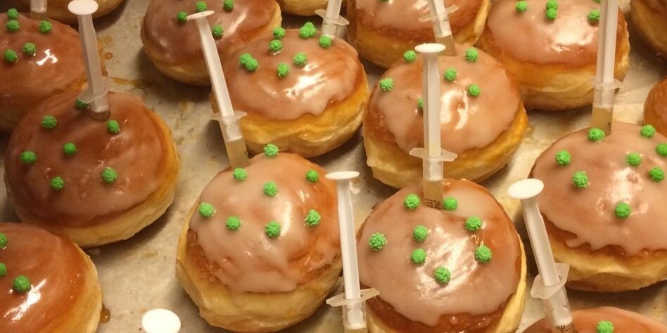 A local bakery sells vaccination pastry with a syringe filled with gin.
