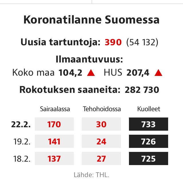 Finnish situation with vaccines better than I expected. 280 000 vaccinated. Total deaths 733. Only 30 now in intensive care.