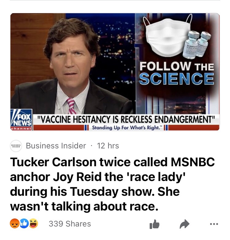 "Here's the race lady from MSNBC finally putting her Harvard degree to work," Carlson said, referring to Reid. "It's simple she said — just charge people who don't get the vaccine with felonies."