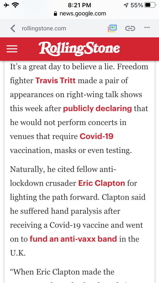 When Eric Clapton made the statement about the freedoms being infringed upon, that really resonated with me,” Tritt said on conservative talker Steven Crowder’s Louder With Crowder Internet show. “Aside from the personal effects that he had had from getting the vaccine, I just agreed from a philosophical standpoint about we have to preserve our freedoms. We’ve never been in a situation, that I know of, in this country where the government has been allowed to force you to take medicine that you may or may not need.”