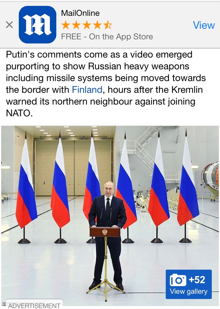 Putin can't wait for Finland to join NATO. Portable missiles now at Finnish border. Why? To make a point. They could be launched from anywhere to hit Finland.
